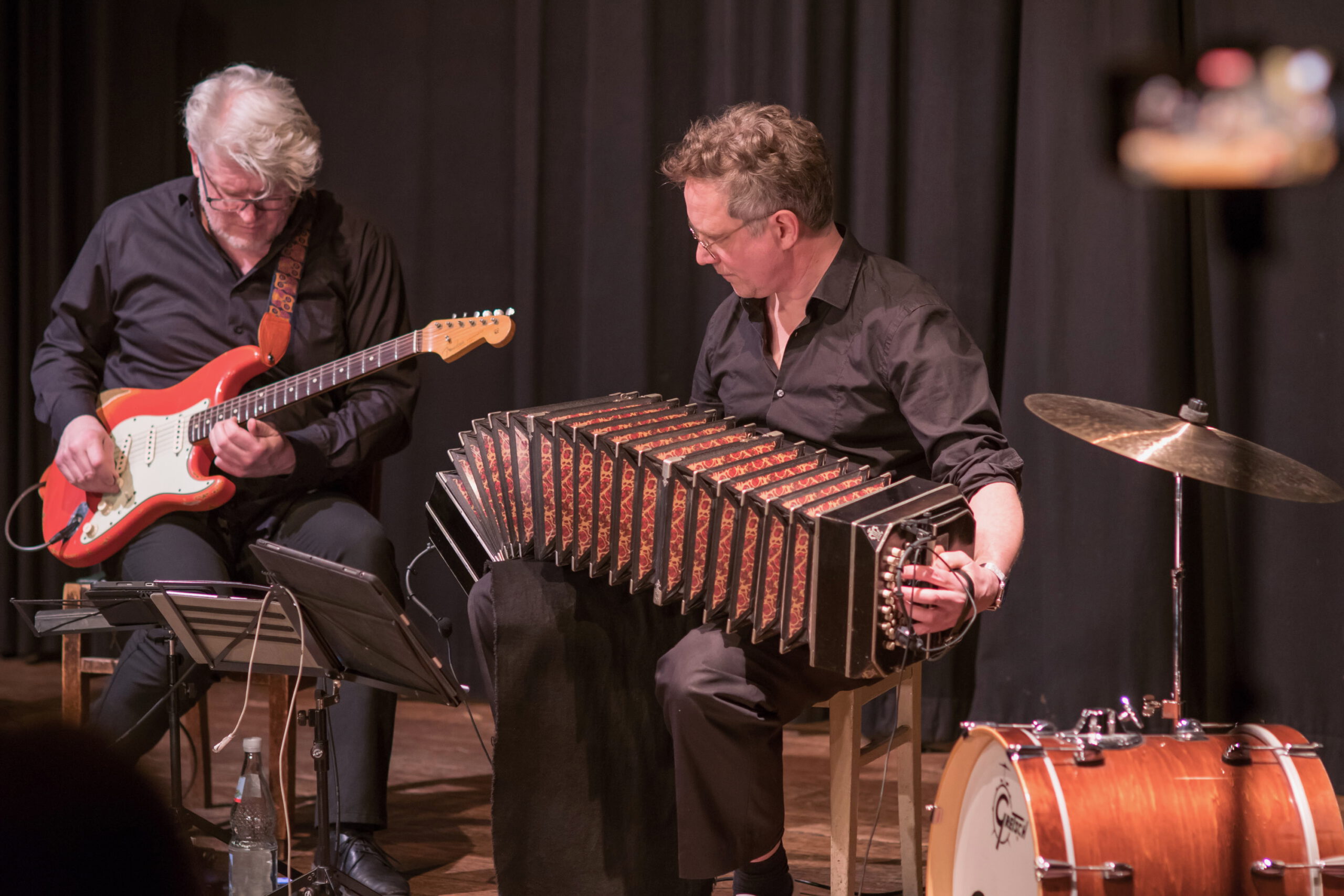 Gitarrist Jochen Seiterle nutzt sein Instrument als Klanglabor: Mit Effekten und einer stilistischen Bandbreite zwischen Django Reinhardt und Jimi Hendrix kontrastiert er die lyrische Dichte des Bandoneons. Rhythmisch getragen wird das Set von Tobias Stolz an den „Hybrid Drums“ – einer Kombination aus akustischem Schlagzeug und elektronischen Triggern – sowie von Bogdan Alexander, der in einer technisch anspruchsvollen Doppelrolle Piano und Bass-Synthesizer gleichzeitig bedient.